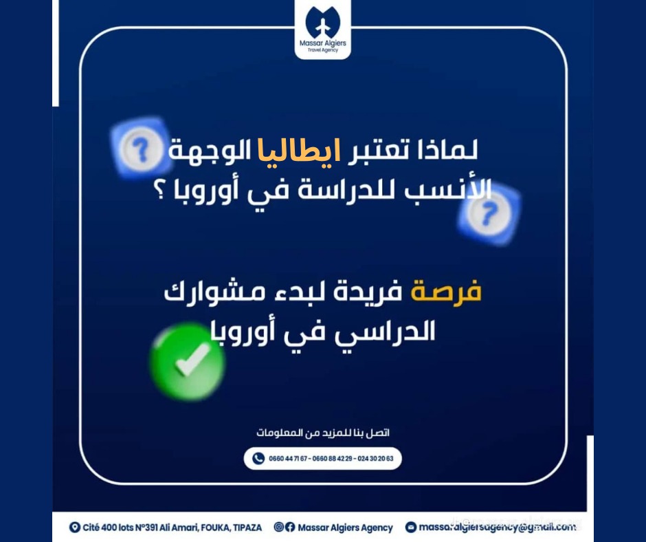• Massar Agency m’a accompagné sans faille pour partir étudier en Ukraine. Ils ont géré le visa avec une efficacité impressionnante et m’ont accueilli à l’aéroport pour un démarrage en douceur. Professionnels, réactifs et humains — je recommande vivement Massar Agency pour un départ serein et réussi.